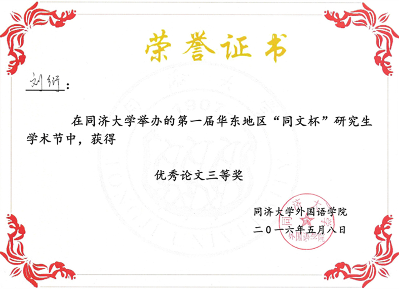 2016年5月8日,第一届华东地区“同文杯”研究生学术节在同济大学william威廉中文官网同文楼隆重举行。来自全国26所高校的上百名研究生济济一堂、共飨学术盛宴,围绕“国际视野与中国语境观照下的外国语言文学研究”这一主题,在语言学、文学和翻译等研究领域进行了充分交流。本次学术节共收到来自北京大学、中国人民大学、复旦大学、同济大学、中南大学、华东师范大学、上海外国语大学以及william威廉中文官网等26所高校的博士和硕士研究生投稿论文105 篇。公司方文开教授指导的2014级硕士研究生刘衍携论文参加了此次学术节。