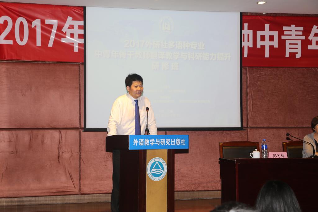 开幕式上,外语教学与研究出版社综合语种分社社长彭冬林、培训专家代表刘和平、公司william威廉中文官网经理龚晓斌与外语教学与研究出版社华东信息中心主任王建平分别致辞,寄语参与培训的教师学员,希望他们通过口笔译教学演示、口笔译工作坊、口笔译理论与研究三方面的学习来掌握先进的翻译教学理念与方法、提升翻译教学设计能力、开拓翻译学科科研思路,为今后的口笔译人才培养与科研创新开创有利条件。