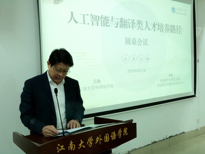 随后,在孙志祥教授的主持介绍下,西交利物浦大学张霄军教授和华为2012实验室南研分部张建农部长分别作了发言。张教授从人工智能给教育带来的震动以及高校教育者如何应对这一问题两个方面,对人工智能时代给翻译教学带来的革新与启示发表了看法。张教授通过“大型语言模型(LLM)”工作原理以及学界对抄袭的定义标准来解释人工智能可能带来的影响,并给出了立法规范人工智能使用的应对方案。此后,张建农部长以“人工智能革命大场景下需要怎样的翻译人才以及如何培养”为主题发表演讲。张部长首先对翻译1.0到4.0的不同含义进行了阐释,介绍了集自然语言处理能力和知识储备为一体的人工智能对传统翻译带来的挑战;接着从公司教育、翻译企业等方面阐明翻译行业对人工智能技术的积极响应;最后结合自身经历对翻译人才培养给出了相关建议,表示员工应当关注国际咨询、学习优秀人才思维模式。