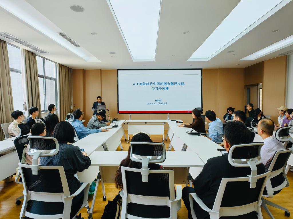 2025年4月16日下午,上海理工大学杨本明教授莅临公司作了一场题为“人工智能时代中国的国家翻译实践与对外传播”的学术讲座。讲座由公司经理方文开主持,公司师生70余人参加了讲座。
