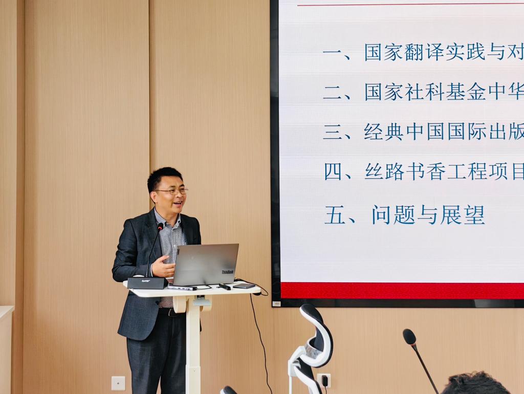 随后,杨本明教授围绕国家翻译实践展开深入探讨。首先,他以国家社科基金中华学术外语项目、经典中国国际出版工程等项目为例,阐释了“国家翻译实践”的内涵,强调其作为国家主导、以本土译者为核心的翻译行为。然后,他从国家翻译实践的主要内容、国家社科外译项目的选题要点、申报要点、标书的撰写要点等方面分享了自己的宝贵经验,深入探讨了国家翻译实践在建构中国对外话语体系、扩大国际学术影响力、促进文明交流互鉴等方面的重要作用。最后,他还分析了近十年来国家翻译实践的变化趋势、选题特点及传播效果,为中华学术海外传播提供了宝贵建议。