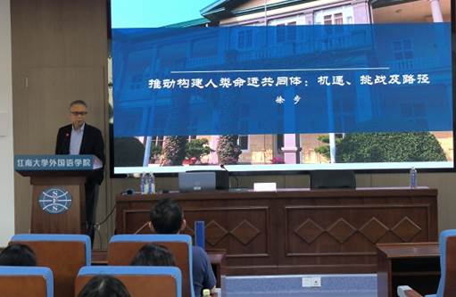 随后,徐步大使根据外语研究者在文学和语言学向区域国别学转型过程中遇到的困难展开指导,他指出外语学习者和研究者应当全面、充分地了解当今时代特点,同时,应看到当前世界之变、时代之变、历史之变。他以美国副总统万斯(J. D Vance)创作的《乡下人的悲歌》为例,阐明文明冲突论、文明优越论等错误观念加剧了不同文明之间的隔阂,严重阻碍了国际社会的交流与合作,必须摆脱意识形态的偏见,坚决摒弃冷战思维,在文明交流互鉴的基础上,真正做到相互尊重、共同发展。接着,他从“修昔底德陷阱”理论展开,带领在场师生进入磅礴宏伟的世界大国之争的历史画卷,深入阐述了国际社会交流合作中可能面临的机遇与挑战,引导师生从更广博的视野深入认识人类命运共同体的内涵,理解构建和推动人类命运共同体是世界变得更美好的必由之路。最后,徐步大使强调,我们在坚定文化自信的同时,要以全球化的视野、更宽广的胸怀来看待这个世界。
