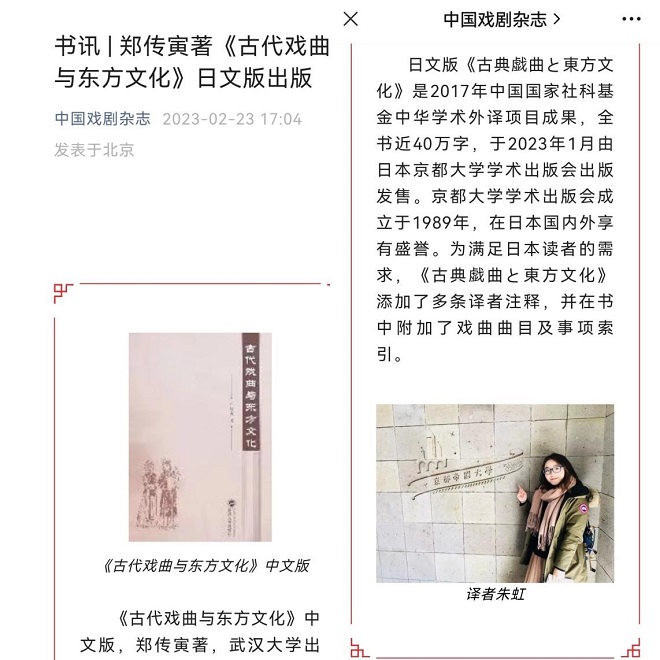 《古代戏曲与东方文化》中文版,郑传寅(武汉大学艺术公司二级教授)著,国家社科基金项目最终成果,国家“十一五”重点规划选题,是系统考查中国古代戏曲和东方文化关系的学术专著。该著作将中国古代戏曲置于东方文化的宏阔背景之下进行观照,在与日本、越南、朝鲜半岛传统戏剧的比较中概括中国古代戏曲的特点,发掘其东方文化蕴涵。《古典戯曲と東方文化》是其日译版,也是2017年国家社科基金中华学术外译的项目成果。日文译本近40万字,译者在原著的基础上进行了适量删减和部分修正。由于书中引用了大量古代戏曲唱词,读起来颇为晦涩难懂,为了满足日本广大戏曲爱好者的需求,译者在翻译过程中添加了诸多名词概念注释,并在书中附加了戏曲曲目及事项索引,具有较强的普适性及可读性。该译著于2023年1月由京都大学学术出版会正式出版发售。京都大学学术出版会成立于1989年,隶属日本国内最高学府之一的京都大学,依靠本校雄厚的教学和科研力量,出版了大量高水平、高质量、适应多层次需要的人文社科类专业书籍,在日本国内外享有盛誉。