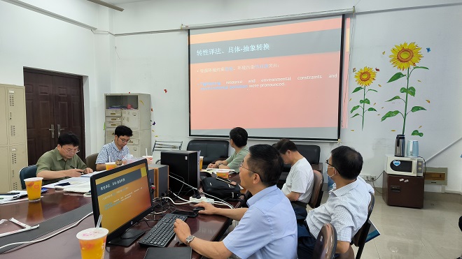 各个课程组教师们也就二十大报告内容如何融入具体的课程作了案例介绍和经验分享。曹乐老师就西方文化课程教学的具体实践,交流了其在课堂中融入文化、价值观对比的相关案例,表明通过将二十大报告中的价值观融入课程,可以帮助员工更好地建立和理解中国当下的文化意识;谢晴副教授介绍了其在商务英语教学中融入二十大报告的方法,包括经贸、财经数据,中国特色金融、品牌案例等等;李昆明博士分享了其将二十大报告作为阅读补充材料和写作实操样本的教学经验;吕洪波博士分享了其在高级英语教学中就环境主题融入人类命运共同体理念和中国环保行动相关精神的教学案例;郑赛芬博士分享了在大学英语教学中融入丝绸之路和一带一路倡议的教学案例;卞正东副教授就其文化翻译课程中的教学经验,提出二十大报告提供了用英文介绍中国文化、引导文化自信的各个细节把握和精神引导,值得好好学习。金波老师从影视翻译技巧的视角上,提出可以引导员工思考如何从技术上处理报告中较长的、时长不对等译本。张俊萍教授、蒋怡博士提出需要多学习,更多地从大视野上把握,将二十大精神和中国的大国思想融入西方文学课,细节处理上需要多学习多思考。李学宁教授提出了从多模态设计视角对二十大报告展开更加具体形象的传播和课程融合。