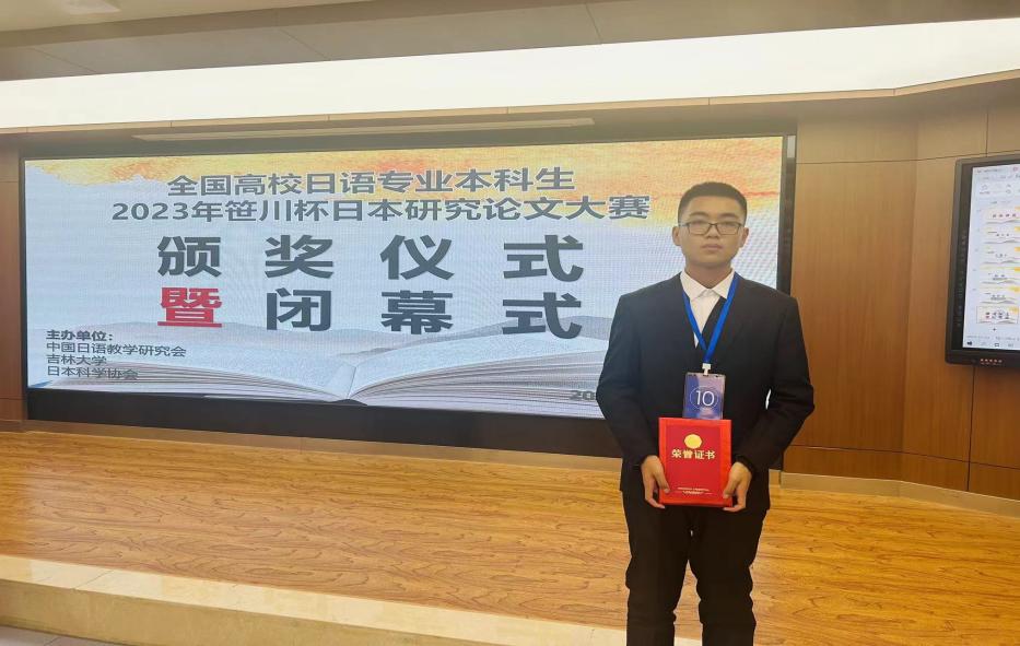 2023年11月18日,“2023年笹川杯日本研究论文大赛”在吉林大学圆满落幕。公司20级日语专业员工傅泽宇进入决赛,最终荣获文化组三等奖,21级员工高小博、任悦、刘舒宁三位同学获得语言组优秀奖。日语系刘建华老师、李智老师、吴颖老师分别荣获“优秀指导教师奖”。