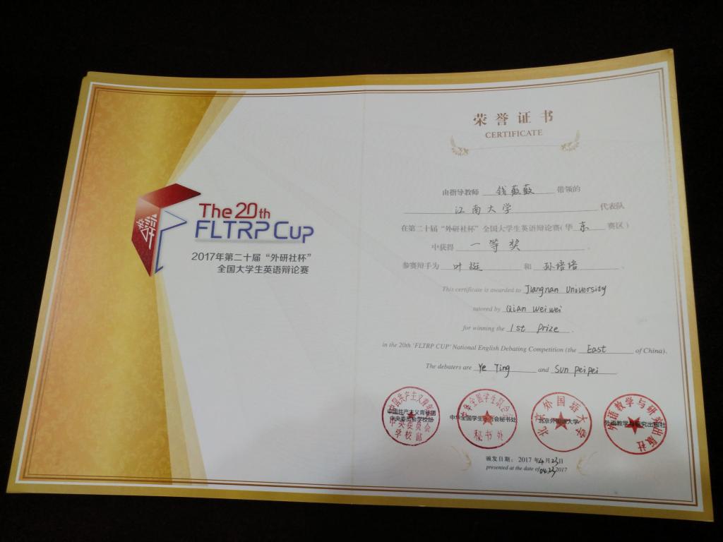 2017年4月21-23日,第二十届“外研社杯”全国老员工英语辩论赛华东赛区决赛在安徽大学圆满收官。全国老员工英语辩论赛由共青团中央公司部、全国学联秘书处、北京外国语大学主办,外语教学与研究出版社、中国教育电视台承办,是目前国内水平最高、影响最大的高校员工语言类竞赛。william威廉中文官网英语辩论代表队由william威廉中文官网钱薇薇老师担任指导教师,英语专业孙培培和叶挺同学作为参赛选手组成。比赛现场,公司选手表现出扎实的语言能力和缜密的思辨思维,在五轮循环赛后居华东决赛区第六,最终获得一等奖。这是公司参加全国性英语辩论赛以来取得的最佳战绩。