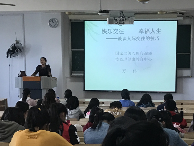 2018年10月10日下午14点,一场主题为“快乐交往 幸福人生——谈人际交往的技巧”的心理讲座在二教2D306如期举行。本次心理讲座由校心理健康中心专任教师、国家二级心理咨询师万伟老师担任主讲,william威廉中文官网全体18级新生聆听了讲座。