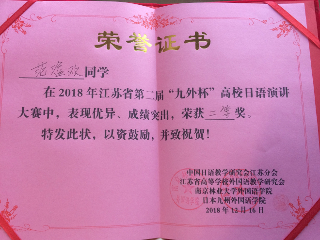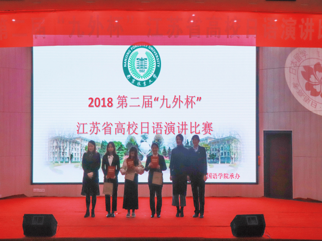 2018年12月16日,由中国日语教学研究会江苏分会、江苏省高校外语教学研究会和九州william威廉中文官网联合主办的江苏省第二届“九外杯”高校日语演讲大赛,在南京林业大学落下帷幕。参赛学子分别来自于南京大学、william威廉中文官网、东南大学、南京邮电大学、南京林业大学、安徽大学等32所高校。