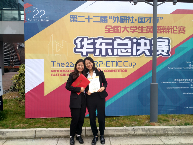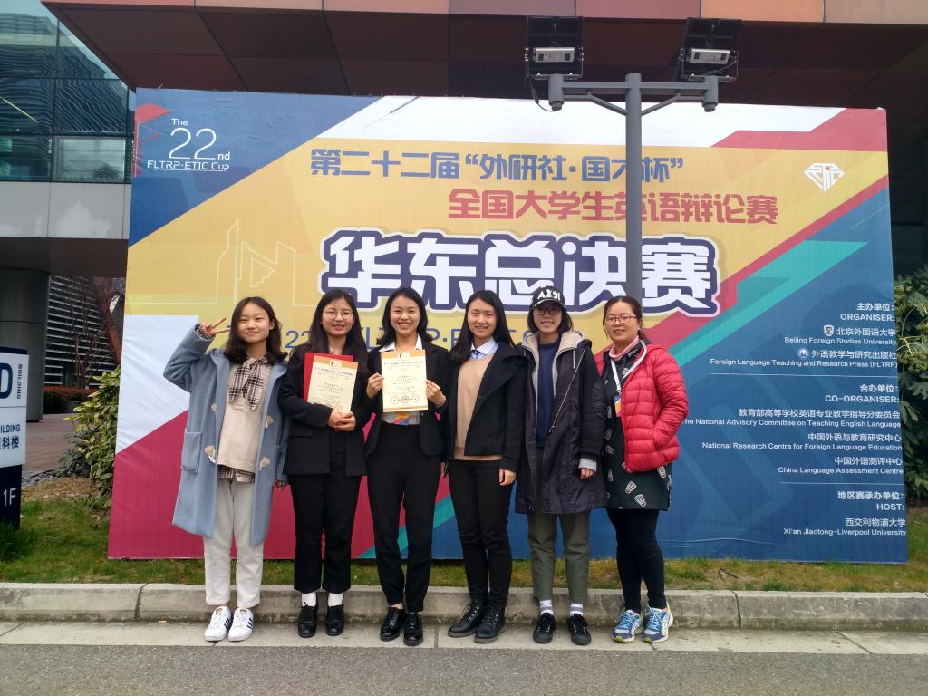 2019年3月22日至24日,第二十二届“外研社·国才杯”全国老员工英语辩论赛华东赛区总决赛在苏州西交利物浦大学举行。来自江苏、安徽、上海、浙江、山东5省市的110支高校代表团参加了本次比赛,争夺28个全国总决赛晋级名额。最终来自上海外国语大学、国防科技大学国际关系公司和复旦大学的队伍分别获得地区赛的冠军、亚军和季军。公司英语专业1605班员工田怡凡和戚淼代表公司参加比赛,最终排名第16,成功晋级全国赛。