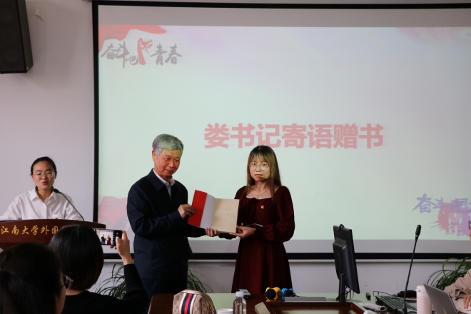 最后由娄国栋老师分享了自己的入党初心和故事。娄国栋老师自1973年3月5日入党,工作期间与青年为友,全心致力于员工工作。他强调了青年人的时代责任与历史使命,青年老员工要重视大学时期,将自己的初心和使命体现在日常的学习生活中。娄国栋老师说:本次团课可以激发员工们的内在动力,发展自我,奉献自我,发挥青年人的作用。“青春是人生最好的阶段,青春的精神应永远保留,青春万岁!”最后,娄国栋老师向英语1904团支部赠书《习近平的七年知青岁月》,让时代青年感受习近平总书记青春时代的力量。