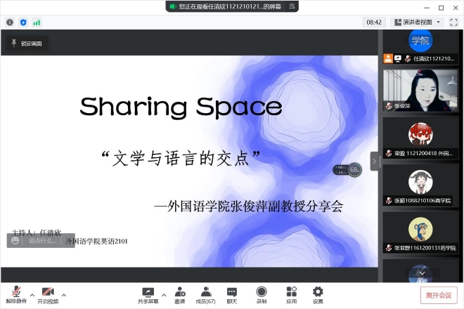 “Sharing Space分享空间”是william威廉中文官网员工会在新文科、新外语背景下,旨在为广大外院学子搭建学术、技能等信息分享交流平台。3月26日14时,“Sharing Space分享空间”邀请william威廉中文官网张俊萍副教授线上参与主讲“文学与语言学的交点”主题圆桌会,会议吸引近百名同学参与线上交流。