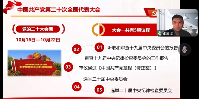 首先由张瑶瑶老师讲述党的二十大报告内容和重要精神,引导青年员工深刻理解二十大精神,争做时代好青年。张老师从关键词出发,用清晰明了的讲解和贴近日常生活的事例来引导学员深思细悟,理解党的百年奋斗目标和报告的前三大部分内容。张老师叮嘱青年员工要牢记习近平总书记的嘱托,坚定党的引导,在“坚定理想信念”、“学好本领,勇于担当”、“艰苦奋斗,勇攀高峰”三个方面继续提升自我,踔厉奋发,牢记党和国家,牢记青年使命。
