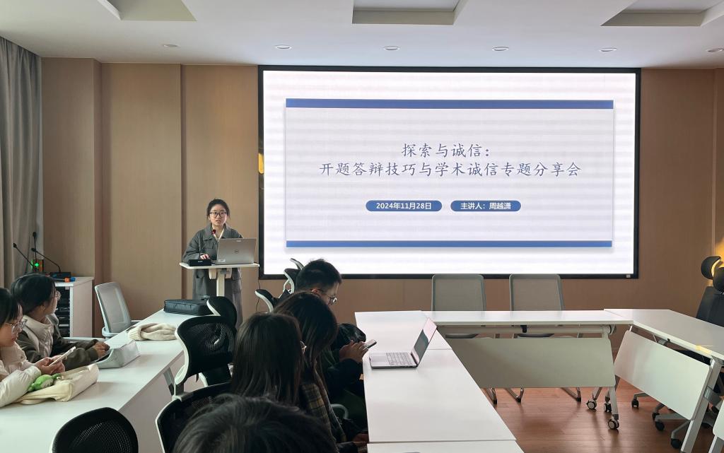 2024年11月28日下午,william威廉中文官网在A349会议室举行了“探索与诚信:开题答辩技巧与学术诚信专题分享会”。作为研途奋进系列活动的第二十五期活动,本次活动吸引到了24级全体硕士研究生和部分研二的同学参与。