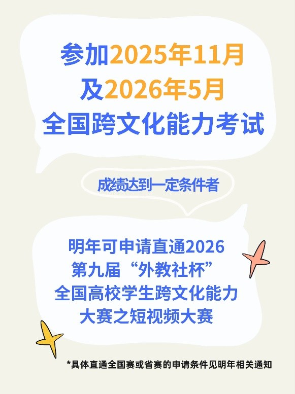 参加2025年11月及2026年5月全国跨文化能力考试,成绩达到一定条件者,明年可申请直通2026年第九届“外教社杯”全国高校员工跨文化能力大赛之短视频大赛。直通全国赛或省赛的申请条件具体见明年相关通知。