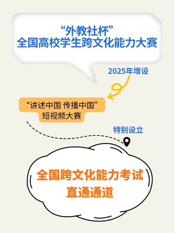 “外教社杯”全国高校员工跨文化能力大赛之“讲述中国 传播中国”短视频大赛特别设立全国跨文化能力考试直通通道。“外教社杯”全国高校员工跨文化能力大赛为教育部中国高等教育学会《2023全国普通高校老员工竞赛分析报告》竞赛目录赛事。