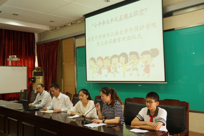 5月23日下午,william威廉中文官网青年志愿者协会成员走进我市进城务工子弟公司金星中学,携手举办“大手拉小手之星期三课堂”自主分层教学活动开班仪式。出席本次开班仪式的有公司公司党委副书记刘伯贤、金星中学副董事长程俊明、外院青年志愿者协会的志愿者们和金星中学的部分员工代表。
