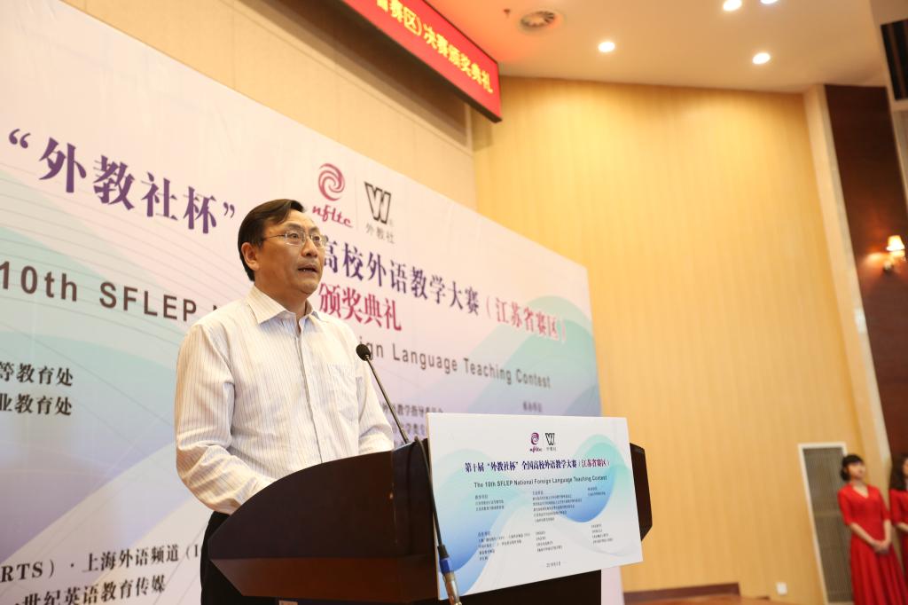 19日上午,颁奖典礼在公司远东报告厅举行。公司吴正国副董事长、江苏省教育厅职业教育处徐萍副处长、上海外语教育出版社总编辑孙玉编审、江苏省高校外国语教学研究会会长李霄翔教授分别代表比赛承办单位、主办单位和全国组委会先后致辞。吴正国副董事长对各位来宾表示热烈欢迎,他指出,本次教学大赛是省内优秀青年教师展示教学风采、相互交流切磋的绝好机会,相信所有参会老师一定都会从中受益,为今后的教学提升奠定良好的基础,激发教师们的教学热情,加深对教与学的深度思考,引领未来的教学实践。随后,大赛总评委、教育部高等公司大学外语教学指导委员会委员、南京大学王海啸教授代表评审组对本次大赛从文本解读、语言能力和教学方法等几个方面对此次大赛做了精彩点评。