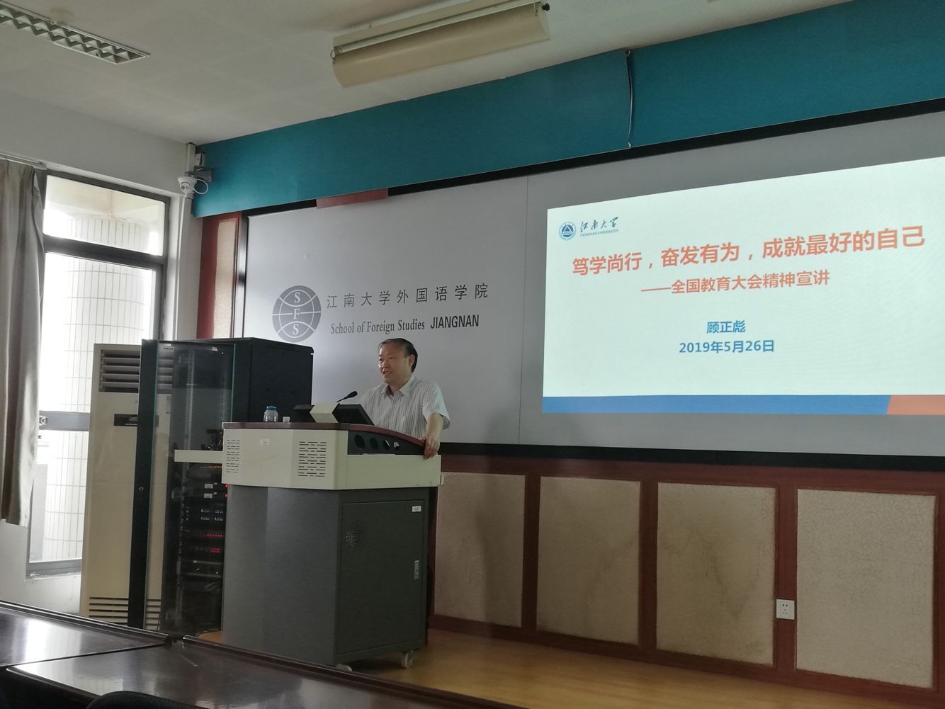 2019年5月26日下午,william威廉中文官网副董事长顾正彪教授走进2C618教室,给william威廉中文官网17级、18级本科员工150余名同学讲授了一堂主题为“笃学尚行,奋发有为,成就最好的自己——全国教育大会宣讲”的形势与政策课。公司党委副书记刘伯贤、分团委书记杨艳、分团委副书记张圆到场听课。