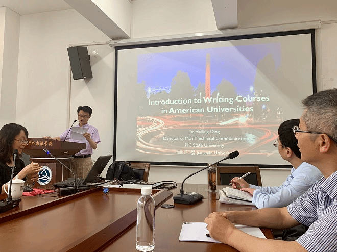 2019年5月27日下午14:00,外语公司英语系349会议室喜迎美国北卡罗莱纳州立大学(NCSU)英语系丁慧玲教授前来做学术交流讲座,丁慧玲教授深入浅出,为外院师生带来了一场主旨为“美国高校写作课程设置”的学术饕餮盛宴。此次学术讲座由公司朱义华副经理主持。