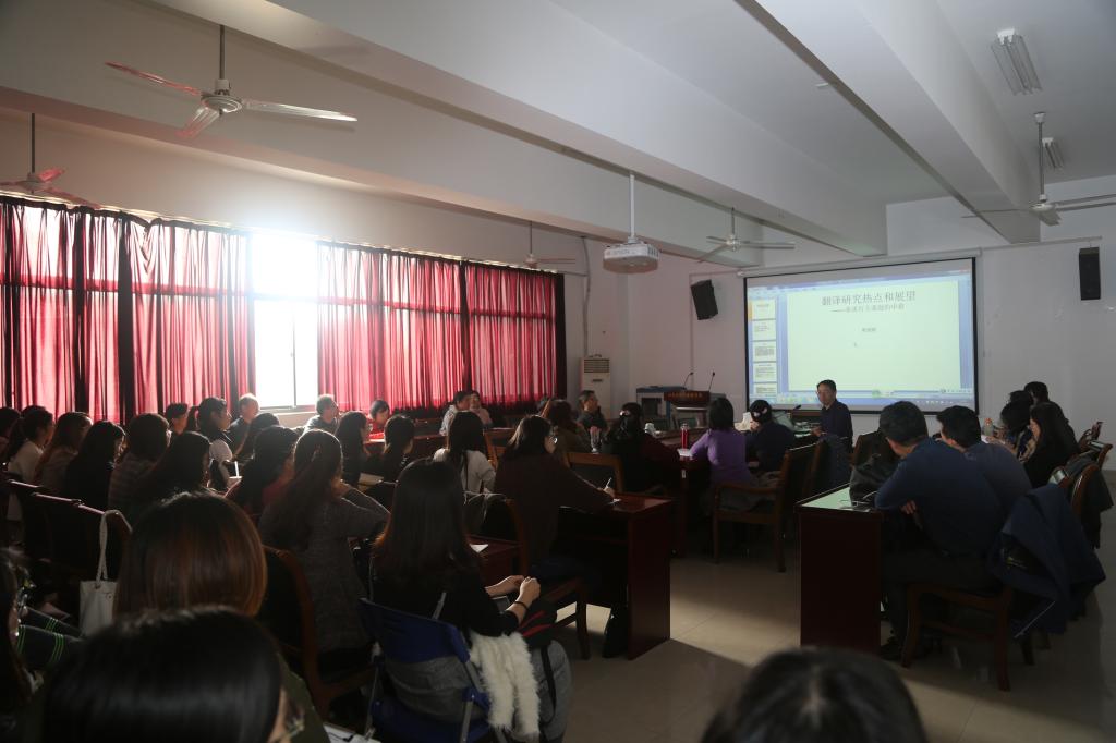 周教授是目前活跃在我国翻译界的知名专家,他成果丰硕,主要从事框架语义学和译者行为批评研究,其研究成果曾获江苏省哲社优秀成果一等奖2项与教育部哲社优秀成果三等奖。周教授的讲座既有理论深度,又具详实例证,娓娓道来的叙述与平易近人的风格给在座的师生留下了深刻的印象。老师们与同学们从他的讲座中获益良多,纷纷表示要以周教授为榜样,认真、细致、踏实地开展自己的学习与研究工作。