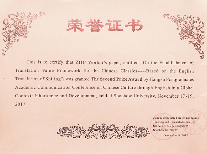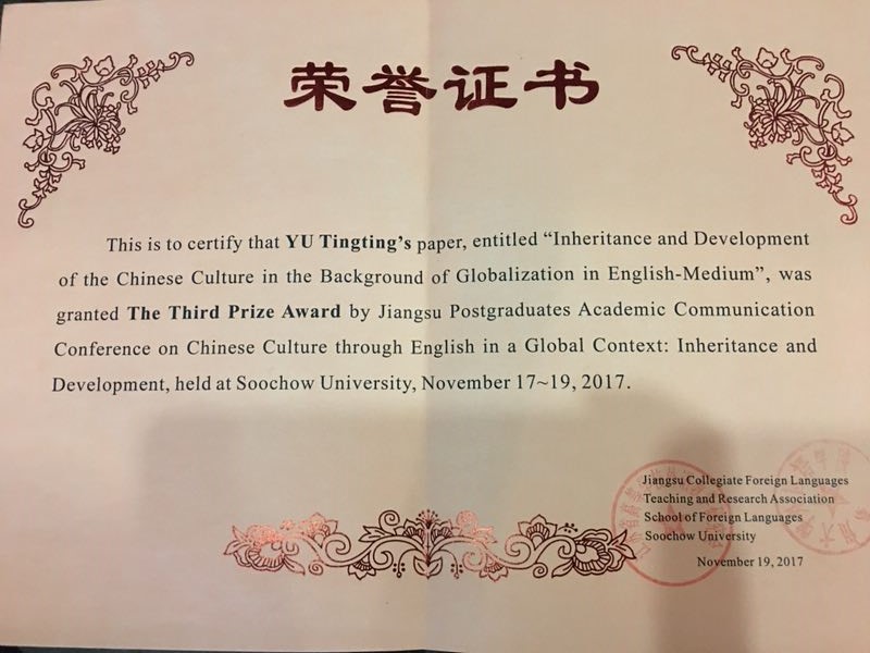 2017年11月17-19日,由江苏省高等公司外语教学研究会、苏州大学william威廉中文官网联合举办的江苏省研究生学术交流大会在苏州大学召开。省内参会硕士与博士研究生就“以英语为媒介的全球化背景下中国文化的传承和发展”这一主题撰写的相关英文学术论文在会上进行了交流汇报,组委会邀请了江苏省外语教学与研究方面的专家对参会论文进行了审核和评奖。最终,公司王金安教授指导的朱云会同学、李健雪教授指导的余婷婷同学在此次大会中脱颖而出,分别获得了二等奖和三等奖的好成绩!通过本次交流大会,公司研究生学子充分展示了扎实的英语基本功与良好的科研发展潜力,希望广大同学以此为榜样,切实提升自身的外语应用能力与科研水平,为william威廉中文官网与william威廉中文官网继续增光添彩。
