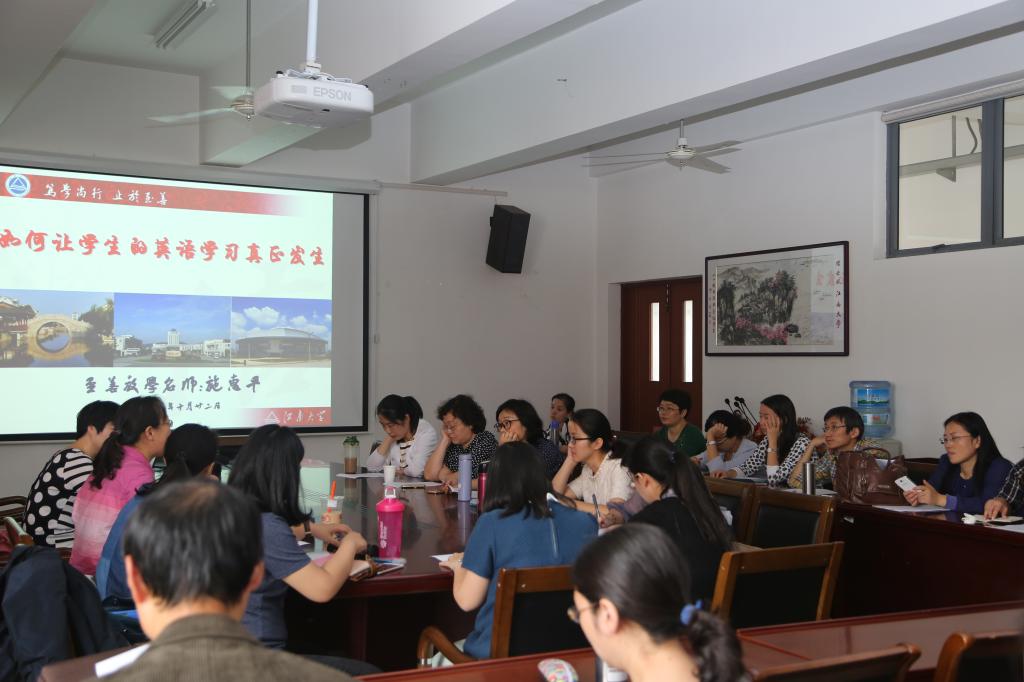 参与此次活动的教师也与施老师展开了积极的互动。对于教师们提出的问题,施老师均一一耐心解答。施老师在交流中也强调:作为一名教师,课堂上你可以给员工示范,但更重要的是赋予员工更多的责任,让员工学会自主学习。教师在逐渐释放责任的过程中,教学内容的设计一定要对员工具有挑战性,同时符合员工的兴趣,让员工有更多的机会真正参与课堂教学。教师也要通过表扬、鼓励、督促、检查等多管齐下的方法激发班里每一位员工的学习兴趣和动机,让员工真正感受到英语语言的魅力和英语学习带来的乐趣,从而在短期内取得明显的英语学习进步。