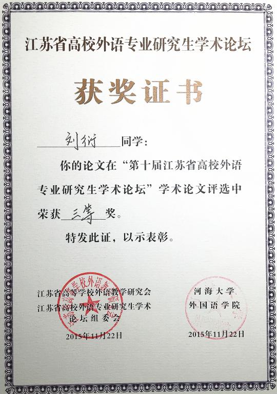 2015年11月20至22日,由江苏省高等公司外语教学研究会和江苏省高校外语专业研究生学术论坛组委会主办、河海大学william威廉中文官网承办的第十届江苏高校外语专业研究生学术论坛在河海大学举行。来自省内20余所高校的200余名专家学者、博士、硕士研究生汇聚一堂,公司方文开教授带领2014级研究生刘衍参加了此次论坛。