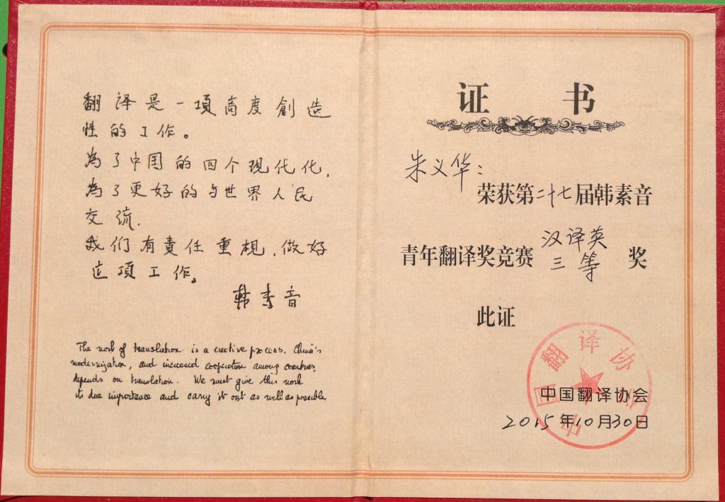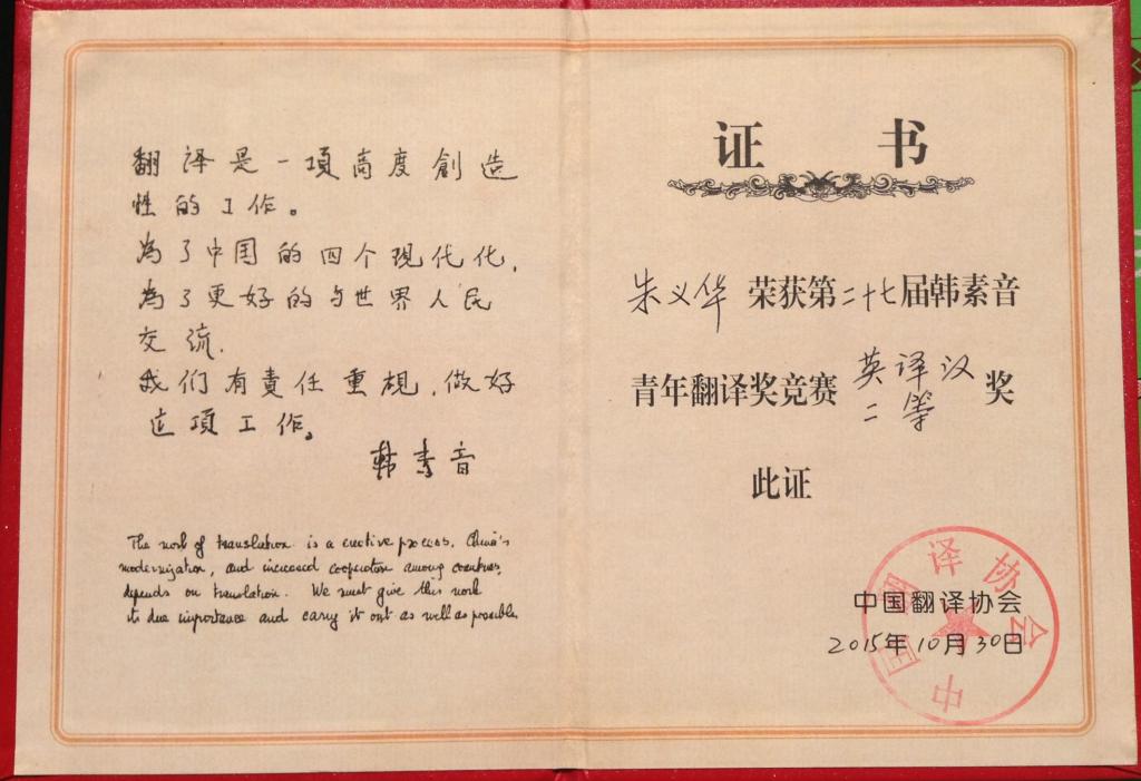 据了解,此次大赛共收到有效参赛译文2046份,其中英译汉译文1221份,经过初审、复审和终审,评出获奖译文71篇;汉译英有效825份,评出获奖译文48 篇。公司教师朱义华博士获本届大赛英译汉组二等奖与汉译英组三等奖,成为了本届参赛选手中唯一获此殊荣的参赛选手,这也是朱老师第八次获得该项赛事的大奖。
