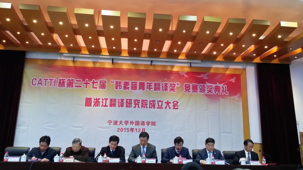 12月5日,CATTI杯第27届韩素音青年翻译奖竞赛颁奖典礼暨浙江翻译研究院成立大会在宁波大学举行,中国外文局局长、中国翻译研究院经理、中国翻译协会会长周明伟,宁波大学党委书记郭华巍,中国外文局国际合作部主任、中国译协常务副秘书长姜永刚,《中国翻译》杂志副主编、中国翻译协会翻译理论与翻译教学委员会副主任兼秘书长杨平,宁波市外事办公室副主任陈国苗,国务院学位委员会“外国语言文学”学科评议组成员、广东外语外贸大学教授、博士生导师、珠江学者特聘教授黄忠廉教授,中国资深翻译理论家、上海大学方梦之教授,新加坡南洋理工大学教授谭慧敏等领导与专家出席了颁奖典礼。大赛评审委员会的部分专家、学者、大赛获奖选手和相关代表参加典礼。