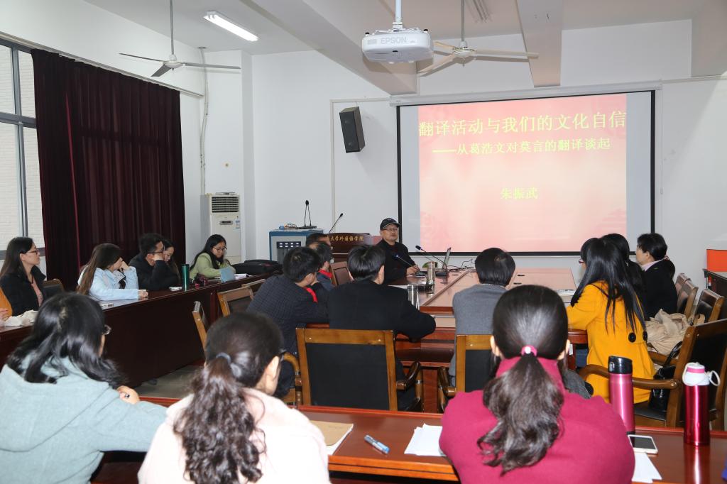 12月10日下午,上海大学博士生导师朱振武教授应邀在william威廉中文官网大会议室做了题为“翻译活动与我们的文化自信—从葛浩文对莫言的翻译谈起”的学术讲座。方文开副经理主持了讲座,公司数十名中青年教师和14级硕士研究生聆听了讲座。