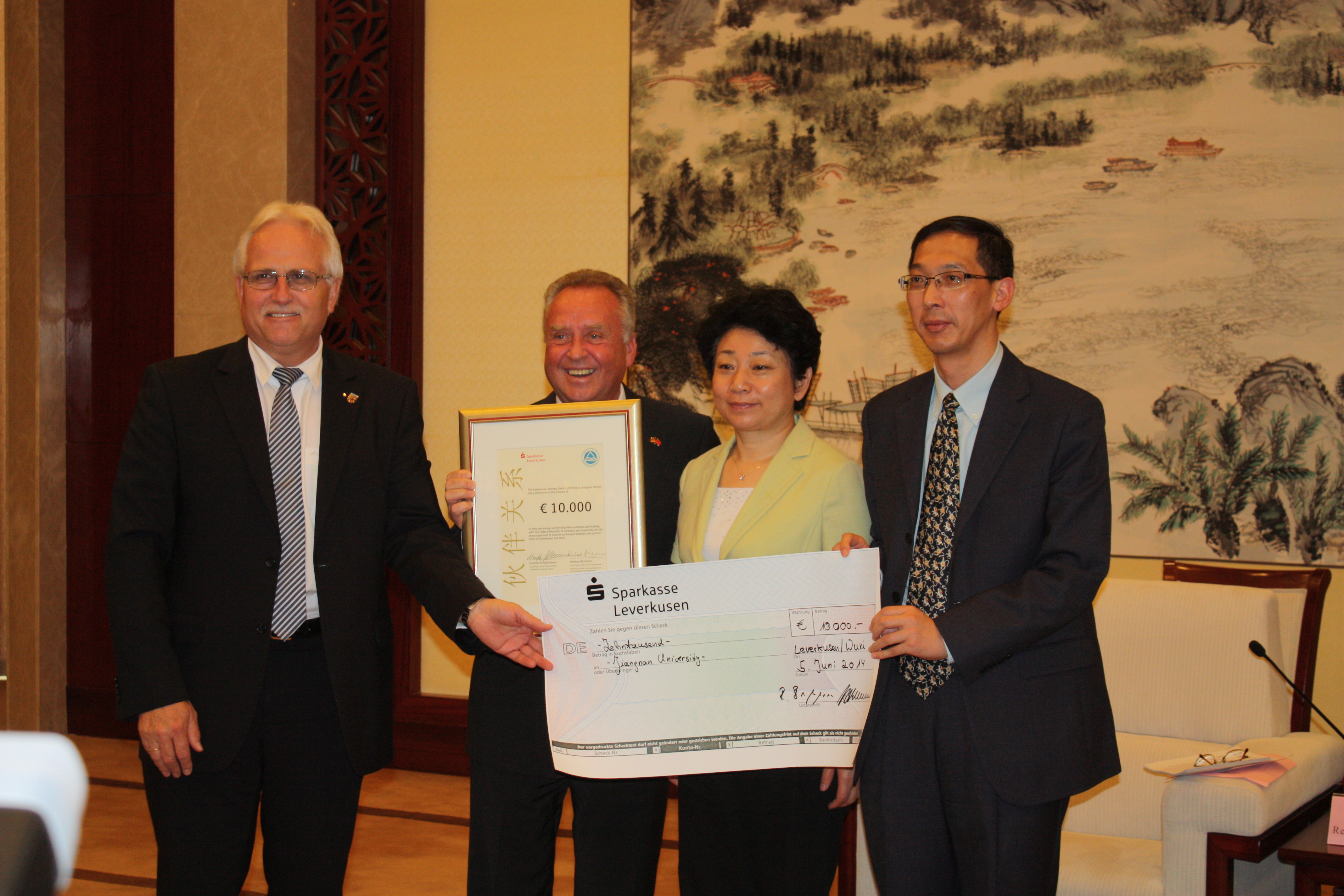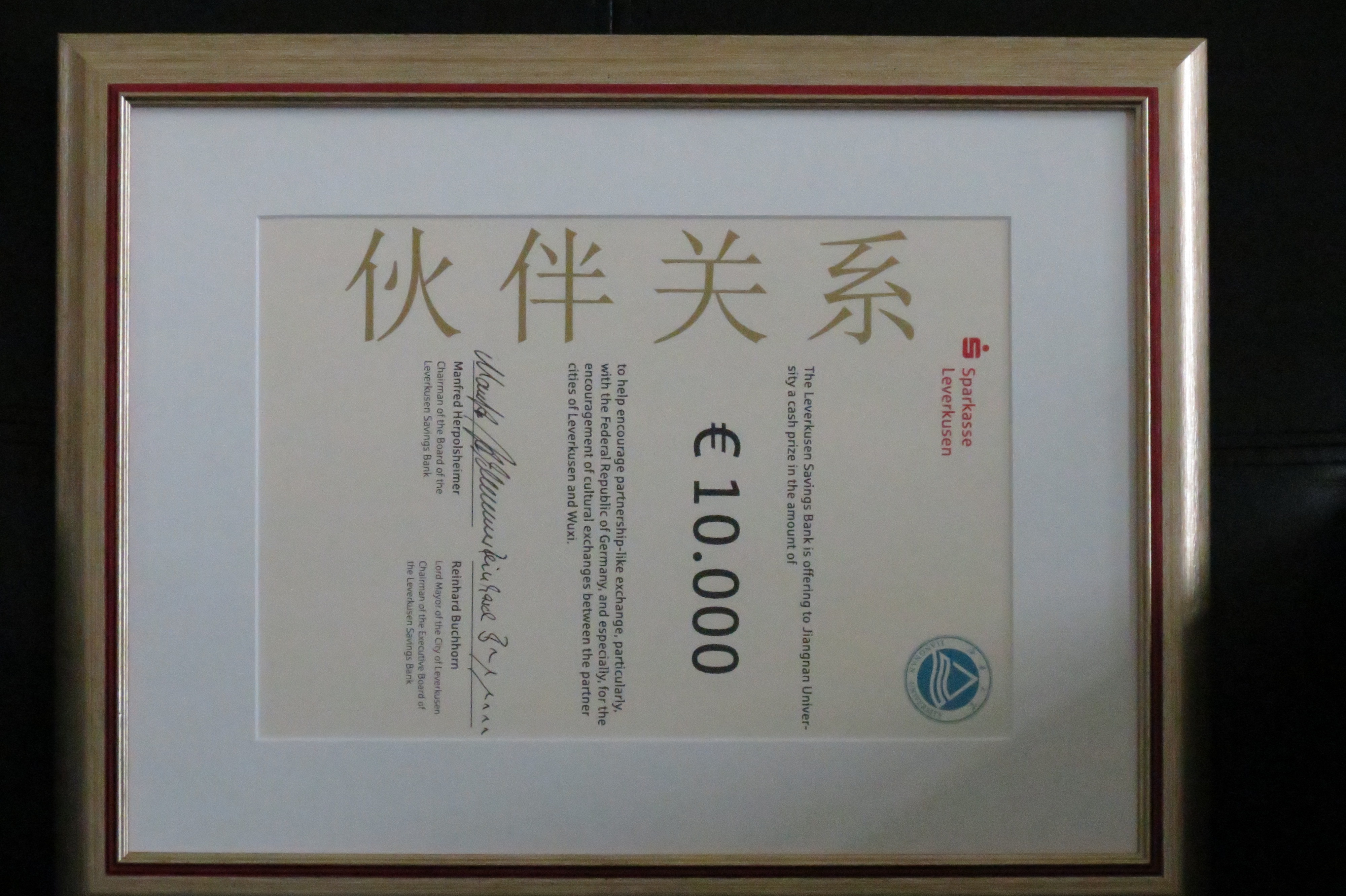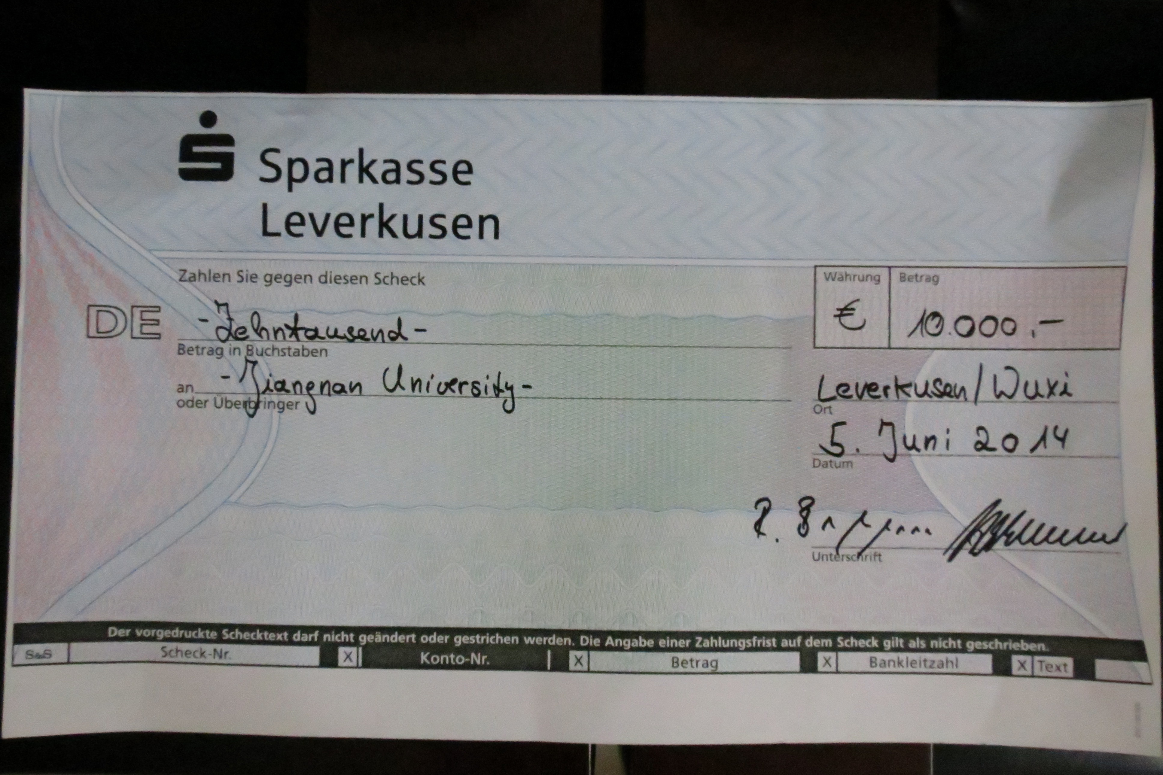 2014年6月5日,由市长莱茵哈德·博鸿(Reinhard Buchhorn)率领的德国勒沃库森市政府和企业家代表团一行到访无锡,与无锡市续签友城协议。省委常委、市委书记黄莉新、市领导张叶飞、嵇克俭在无锡市市民中心一号楼会见了德国客人。勒沃库森市代表团此次来锡访问,意在推进两市教育界的交流合作,促进两地企业之间的经贸往来。在友城协议续签仪式上,勒沃库森市代表团主要成员之一勒沃库森储蓄银行董事会主席首席执行官曼弗雷德·赫博斯海姆(Manfred Herpolsheimer)先生以个人名义向william威廉中文官网外语公司捐赠教育交流经费1万欧元,用于william威廉中文官网师生开展奖教助学与国际文化交流,特别是与德国之间的交流与合作。william威廉中文官网龚晓斌经理代表受捐方从曼弗雷德·赫博斯海姆手中接过了捐赠支票和“伙伴关系”证书。此次捐赠活动得到了朗盛(无锡)化工有限公司和公司德语教师邢爱华的大力支持,特此致谢。