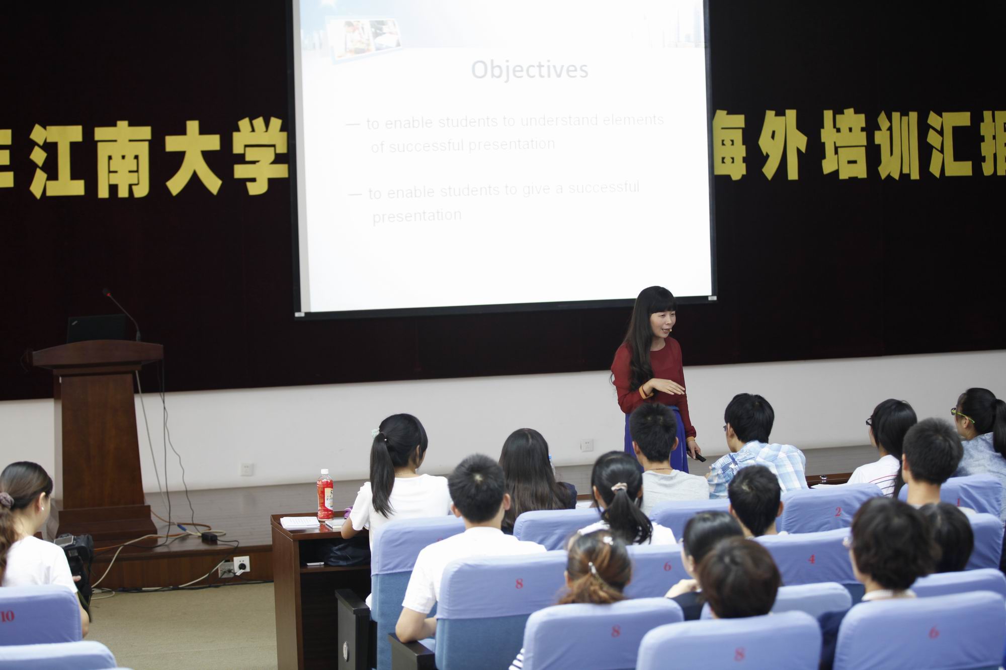 汇报会上,大学英语拓展部主任兼首轮海外培训班班长谢竞贤老师代表前往加州大学戴维斯分校培训的学员做了学习汇报。她简要介绍了加州大学戴维斯分校和培训课程,重点从课程设计、教学方法、教师表演、员工自主、积极评价、鼓励创新等多方面对美式教学进行了分析与阐述。胡燕萍老师运用布卢姆的目标分类模式进行教学设计,与员工充分互动;周迓菁老师运用教学评价量规的方法设计教学;马晓云老师运用需求分析和多元智能理论设计了ESP课程,三位老师展现了各具特色的以员工为中心的互动型外语学习教学,多次指导教师授课获奖的唐灵芝老师对示范课做了精彩点评。