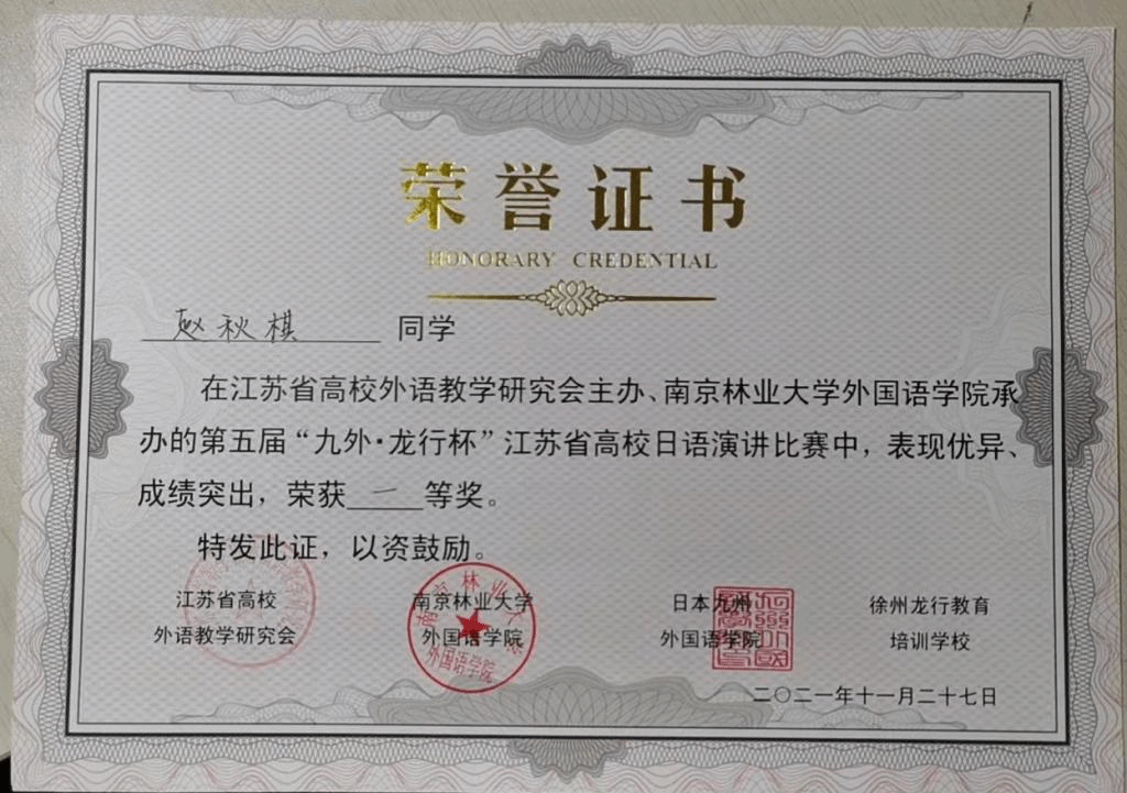 此次因疫情原因,公司选手通过线上参加比赛。初赛为命题演讲,公司选手赵秋棋同学日语水平扎实、发音优美、演讲内容紧扣主题,发挥稳定,以个人第二的成绩进入决赛。决赛即兴演讲环节赵秋棋同学抽到第一位出场,仍凭借较强的临场发挥能力和良好的心理素质,获得了此次大赛的一等奖;中西由美子老师和吴颖老师获得优秀指导奖。