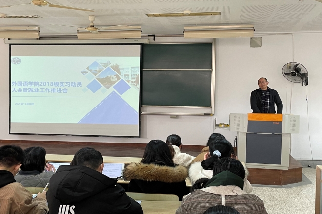 为进一步做好公司2018级员工实习工作,引导员工做好实习前的各项准备,同时推进2022届就业工作的顺利开展,12月28日上午在二教2D108召开2018级实习动员大会暨就业工作推进会,公司党委副书记刘伯贤、副经理顾琦一、英语系副主任杨昊、日语系副主任管纪龙、本科教务王琰玲以及年级辅导员苗文建参加会议。