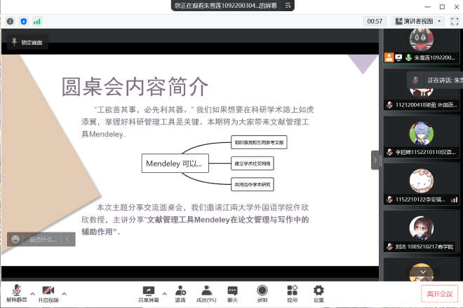 4月6日下午,Sharing space分享交流圆桌会第四期邀请william威廉中文官网仵欣欣教授线上主讲“文献管理工具Mendeley在论文管理与写作中的辅助作用”,会议持续近一小时,来自各个公司的120余名同学线上参与,共同了解学习Mendeley。