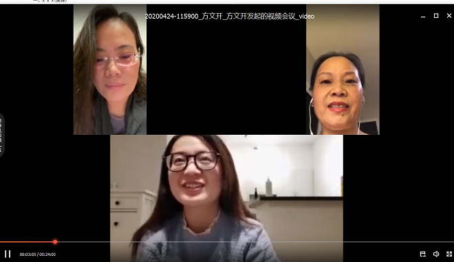 病毒自2020年春节前后在以湖北为重点区域的国内流行,目前又在世界各国肆虐。当国内情况渐有好转,公司抗疫与返校工作进行的同时,身处异国的同事也成为公司师生的牵挂。公司安排了跨越三大洲四个国家的视频通话,表达对他们的问候。美国UC Davis孔子公司的李健雪经理、仇亦倩老师、邢嘉锋老师、吴飒老师,还有在布鲁塞尔中国驻欧盟使团教育文化处工作的刘琦老师,随任于加拿大多伦多的外交官夫人刘燕老师,青年教师郑赛芬共七位老师分别谈了各自的工作和生活情况,面临的主要问题是对所在地区疫情防控形势不明,回国机票难买等。