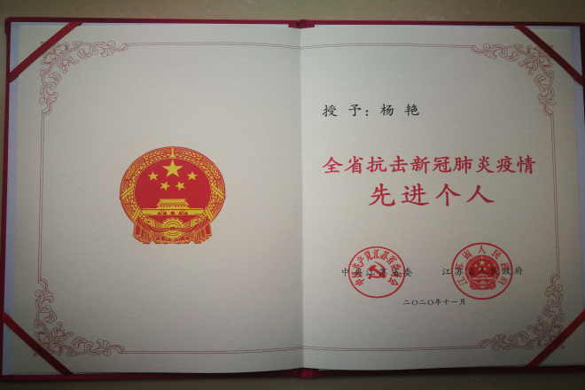 杨艳老师荣获全省抗疫先进个人荣誉称号
