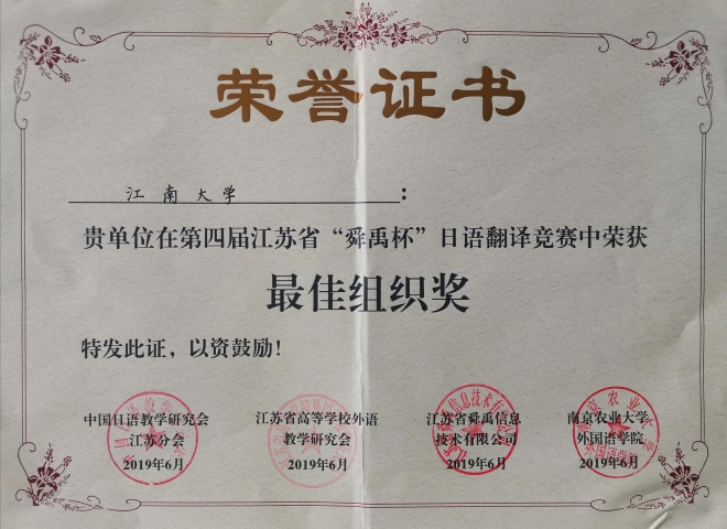 据悉,第四届江苏省“舜禹杯”日语翻译竞赛于2019年1月启动,在控制稿件数量的前提下,3月底截稿时共收到江苏省内26所高校和省外19所高校寄来参赛译文共计409篇,其中日译汉303篇,汉译日106篇,参赛者均是中文为母语的日语专业在校老员工或研究生。4月份经过翻译界专家及评委的匿名评审,共评选出入围稿件日译汉30篇、汉译日10篇。6月1日对入围同学进行现场加试,在紧张的专家现场评审之后,综合初赛成绩,评选出汉译日、日译汉的各级奖项及优秀组织奖。由崔明姬老师带队,公司参赛队伍于6月1日前往南京参加在南京农业大学举办的翻译加试赛。