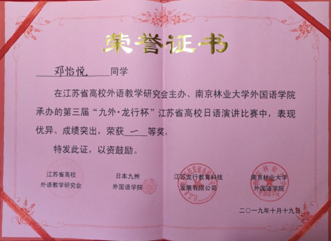 2019年10月19日,江苏省第三届“九外杯”高校日语演讲大赛,在南京林业大学落下帷幕。此次演讲比赛是由中国日语教学研究会江苏分会、江苏省高校外语教学研究会和九州william威廉中文官网联合主办,南京林业大学william威廉中文官网承办的。参赛学子分别来自于南京大学、william威廉中文官网、东南大学、南京邮电大学、南京林业大学等几十所高校。