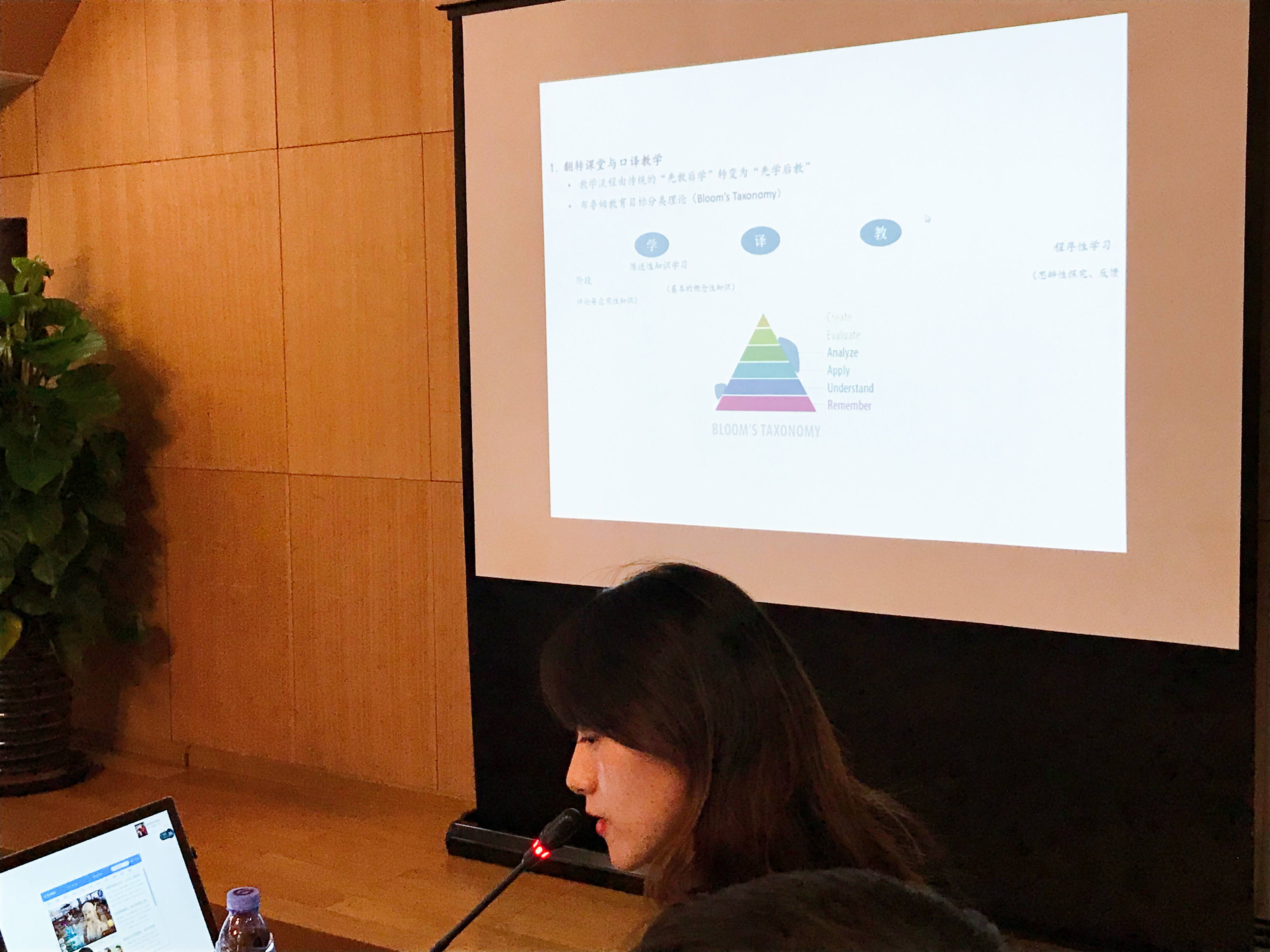 本次研讨会内容丰富,除了主旨发言外,还有六大分论坛同时举行,包括探讨翻译学科/专业未来发展的“经理论坛”、透视翻译学研究热点和趋势的“主编论坛”,以及聚焦“翻译专业vs.语言服务专业”、“技术时代的翻译与翻译教育”、“历史维度的翻译和翻译教育研究”及“基于语料库的本科翻译教学平台建构及其应用”的主题论坛。在来自全国高校的300余位教师学者中,共有30余篇论文在主题论坛期间进行了交流。谢瑜老师的论文《信息技术在构建口译‘翻转课堂’种的教学模式研究——以InterpreterHelp为例》入选专题论坛,并在会上与大家分享探讨。