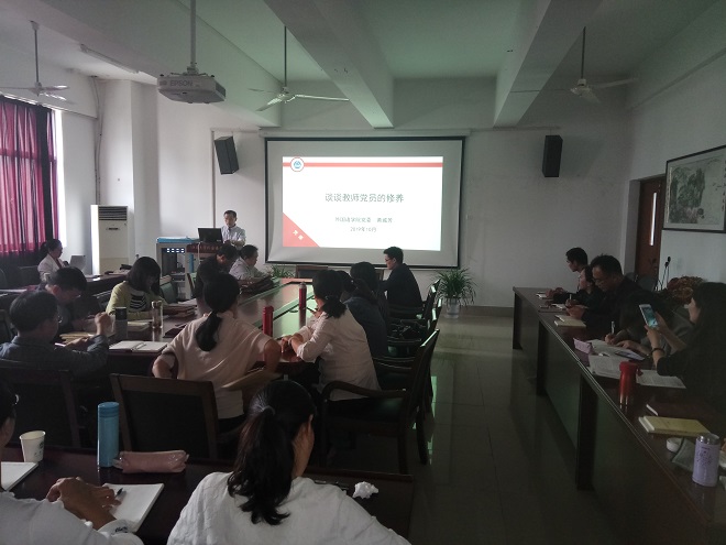 英语系党支部书记彭方针同志以“‘不忘初心、牢记使命’——学习优秀共产党员,做新时代合格的教育者”为题,介绍了焦裕禄、扬善洲、郭明义等优秀共产党员的先进事迹,高度赞扬了他们“鞠躬尽瘁,死而后已”的高尚情操。结合个人学习体会,他说:新时代教育者必须坚守教育报国的初心,坚持正确的政治方向,落实立德树人的根本任务,提升自身综合素养,提高教书育人本领,遵循公司产品规律,为社会主义培养合格的建设者和接班人。