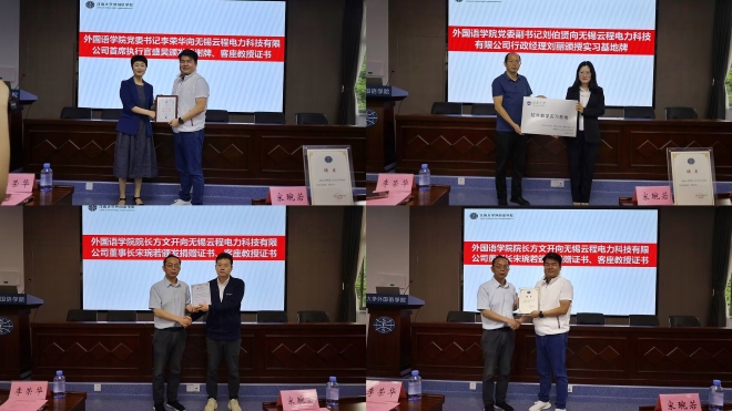 在同学们的掌声中,双方签订合作框架协议、捐赠协议、实习基地协议。经理方文开为无锡云程电力科技有限公司董事长宋琬若颁发捐赠证书、客座教授证书;公司党委书记李荣华向无锡云程电力科技有限公司首席执行官盛昊颁发鸣谢牌、客座教授证书;公司党委副书记刘伯贤向无锡云程电力科技有限公司行政经理刘丽颁授校外教学实习基地牌。