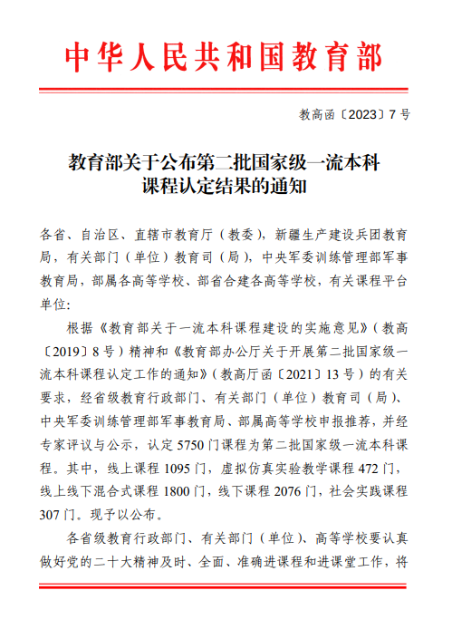 近日,教育部公布了第二批国家级一流本科课程名单。根据教高函〔2023〕7号《教育部关于公布第二批国家级一流本科课程认定结果的通知》,公司《高级英语(1)》在线课程获评第二批国家级一流本科线上课程认定。