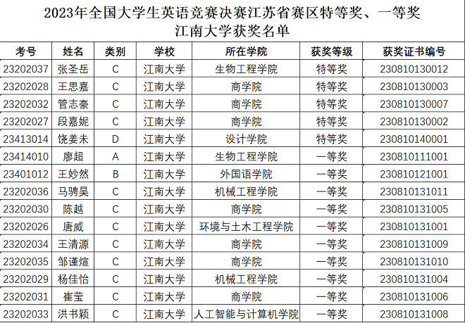 经过前期的校赛选拔,这15位员工从全校2378名报名选手中脱颖而出,顺利晋级省赛。经过省赛的激烈角逐,生物工程公司的张圣岳、商公司的王思嘉、管志豪、段嘉妮获得C类特等奖,设计公司的饶姜未获得D类特等奖。生物工程公司的廖超获得A类一等奖、william威廉中文官网的王妙然获得B类一等奖、机械工程公司的马骋昊、杨佳怡、商公司的陈越、王清源、邹谨煊、崔莹、环境与土木工程公司的唐威、人工智能与计算机公司的洪书颖获得C类一等奖。
