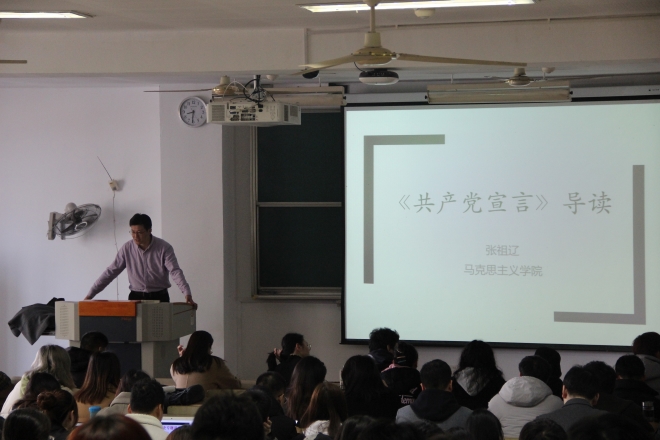 其后,马克思主义公司张祖辽教授为大家带来开班第一讲:《共产党宣言》导读。他以为何要读《共产党宣言》为起点,明确指出:共产主义是马克思主义的落脚点。政治教育的两个目的是培养人的公民意识和民族意识。张教授深入浅出的分析让同学们对共产党员的标准和共产党人的宗旨有了进一步的深刻感悟和理解。在短暂课间休息后,马克思主义公司刘大禹教授为学员们展开第二讲:《以史为鉴,面向未来:学习习近平总书记关于“四史”的重要论述》 。刘教授谈到了自己去台湾的经历感受,深切体会了学习四史的重要性和必要性。四史是党史,国史,改革开放史,社会主义发展史。学习四史,党史是核心。刘教授提到了三个学习四史的重点:总结历史经验,推进革命和改革经验;吸收历史养料,建设社会主义现代化强国;肩负历史使命,实现伟大中国梦。