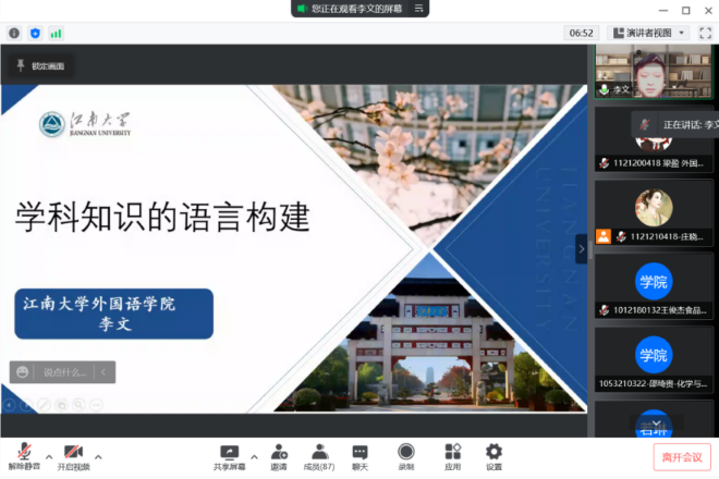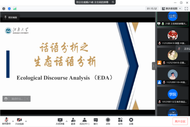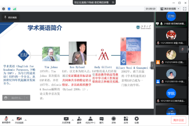 最后,李老师请两位研究生学姐为参会同学介绍探讨了系统功能语言学分别在学术英语、生态话语分析(EDA)中的应用。
