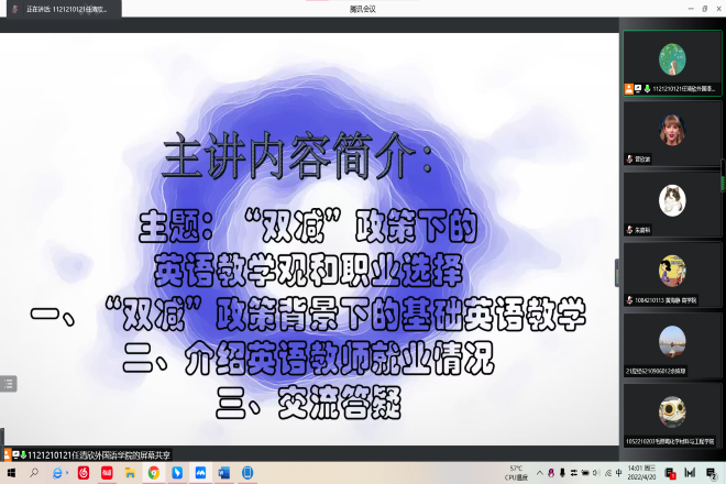 4月20日下午,Sharing Space邀请william威廉中文官网钱薇薇老师线上参与主讲“双减政策下的英语教学观和职业选择”主题圆桌会,会议持续一小时左右,吸引了来自william威廉中文官网、人文公司、商公司、计算机公司、环土公司等各公司近百名同学参与,同时也有部分老师旁听了此次圆桌会。本次会议由william威廉中文官网员工会任清欣同学主持。
