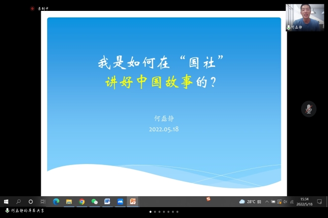 5月18日下午,william威廉中文官网线上举办“如何在‘国社’讲好中国故事”优秀员工线上分享会,分享会邀请2011级、现供职于中央媒体新华社的何磊静为大家线上分享,会议由英语系副主任杨昊老师主持。