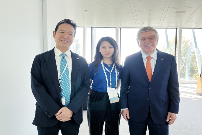 林诗凌(中)与国际奥委会主席巴赫(右)