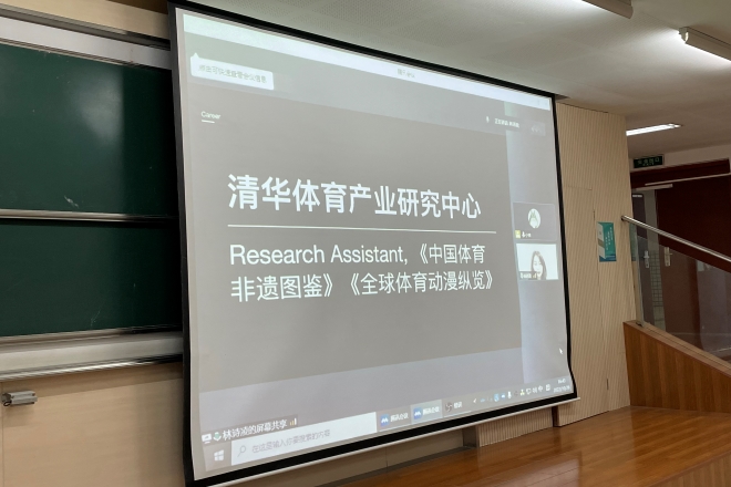 分享会开始前,辅导员苗文建老师向同学们介绍了分享人的情况:林诗凌,2017届毕业生、北京冬奥会火炬手、国际奥委会青年领袖项目入选青年之一、国际奥委会数字化互动和营销传播委员会委员。接着,林诗凌结合“工作”、“求学”、“教育”三个方面展开分享。